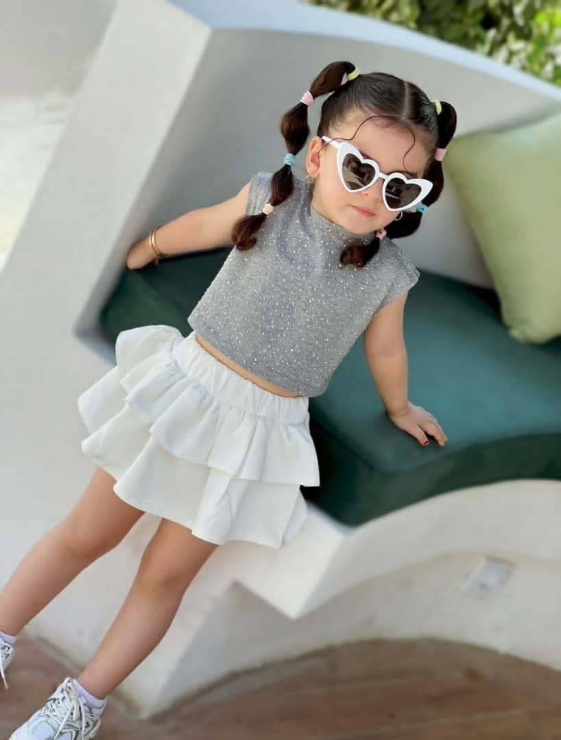 سایز ۵۵: قد کراپ: ۳۴، پهنا: ۴۲، قد دامن: ۳۵، پهنا کمر: ۲۵